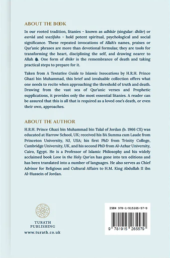 Taken from A Tentative Guide to Islamic Invocations by H.R.H. Prince Ghazi bin Muhammad, this brief and invaluable collection offers what one needs to recite when approaching the threshold of truth and death. Drawing from the vast sea of Qur’anic verses and Prophetic supplications, it provides only the most essential litanies. A reader can be assured that this is all that is required as a loved one’s death, or even their own, approaches.