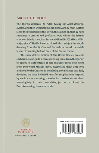 This new deluxe edition of The Divine Names presents each Name alongside a corresponding verse from the Qur’an to affirm its authenticity. It also features poetic reflections from renowned Muslim poets, expressing their deep love and awe for the Creator. To help bring these Names into daily devotion, we have included heartfelt supplications inspired by each Name - making it easier for readers to use them meaningfully in their own duʿāʾs, just as our Lord, the Ever-Answering, has commanded.